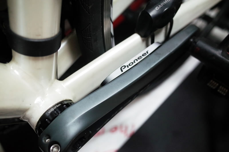パイオニアのパワーメーターはそのままではデータを計測できません。フレーム側に磁石をつけないといけないのだな。磁石を取り付ける位置はパワメの頭のほう。「Pioneer」の「P」より先端に磁石がくるようにします。
