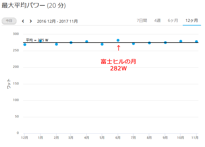2016年12月から2017年11月までの20分最大パワーは平均で275W。ベストは富士ヒル開催月の6月に出た282W。う~ん、成長の「せ」の字も感じられない(-_-;)