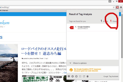 Tag Assistanceのエラーメッセージを読むと、英語でゴチャゴチャ書いてある。反応がないらしいとか何とか。ん~どうすりゃいいんだ? と悩むこと3時間w 自分のアクセスがカウントされないようにGoogle Analyticsオプトアウトアドオンをchromeにインストールしてたのを忘れておりました。なので、これを無効化!