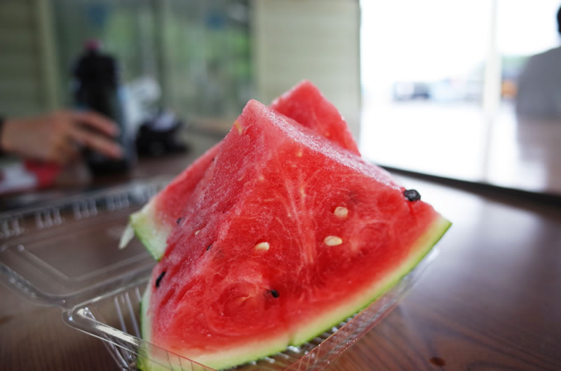 早速スイカをゲット! どうやらデゲメン氏はスイカに塩を振らない文化なのですな!? ワタクシ、逆に塩を振らないスイカは考えられないのであります。