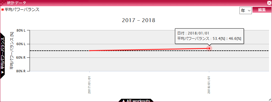 シクロスフィアで1年間の左右バランスを確認してみたところ、ほほぅ、左53.4%で右が46.6%ですか。相変わらず激しい左右差であります(-_-;)