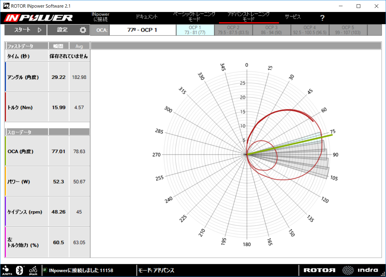 ありがたいことにちゃんと日本語対応で、リアルタイムでパワーやトルクがかかる位置を確認でき、楕円リングの微調整ができるという優れものです。Rotorの楕円使っている人は調整する際に必須かも!?