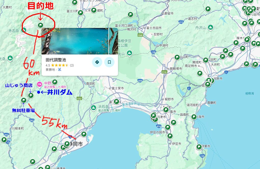 予定ルートは、井川ダムの手前(といっても10kmくらいある)にある長島ダムに停めやすそうな無料の駐車場があるので、そこを拠点に設定。長島ダムから山じゅう商店を抜け、井川ダムに出て、田代調整池を目指す算段です。