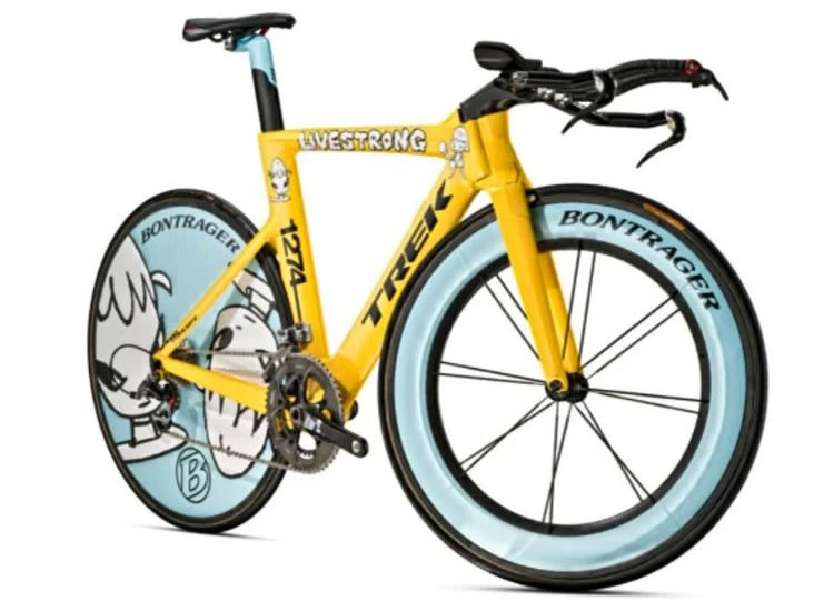 画家の奈良美智さんがデザインしたトレックで、アームストロングの「Livestrong」とコラボしたチャリティー向け自転車のようです。実際にランス・アームストロングはレースで使ったのかしら??
