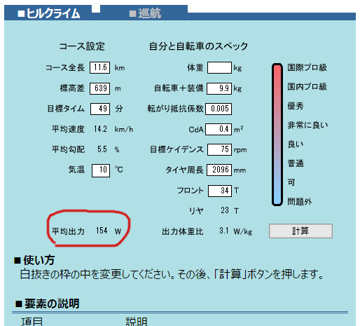 祝日の今日(23日)、デゲンコルプさんのタイム更新を期してヤビツ峠に!! 行く予定だったのですが、起きたら7時過ぎてました(;´Д`)。午後は雨ということで、ローラーでお茶を濁しましたですよ^^;) という訳で、次回ヤビツのタイム更新に向けて必要なパワーを調べてみました。